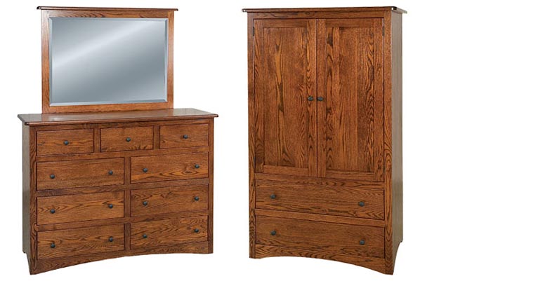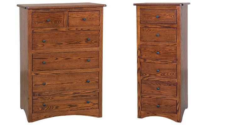 A sleek modern design with features that include bowed tops, 3/4 solid wood case, a unique foot design and full extension dovetailed drawers. Shown in brown maple with Rich Cherry stain and standard knobs.