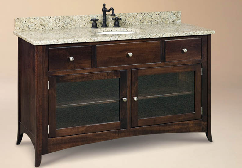 STANDARD FEATURES: single bowl; no usable drawer; available white or bisque ceramic bowls; standard with one 4" backsplash (sidesplashes available for additional cost); solid surface and granite countertops come with 1/2 bull nose edge; all faucet holes are drilled 8" on center (other available for custom charge); faucet fixtures not included; all hardwood dovetailed drawers with full extension drawer slides (false drawer fronts are used in front of sink bowls); all styles with doors standard with clear glass (smoked or decorative glass available for additional charge); adjustable shelving on cabinet styles; all models available in choice of three "Mysteria" solid surface countertop colors: Thunder (grays), Dakota (off white), Tuscany (tan); all models available in choice of three granite solid surface countertop colors: Juperano Gold Dark (cream/tans), UBA Tuba (greens), Brazilian Black (black)